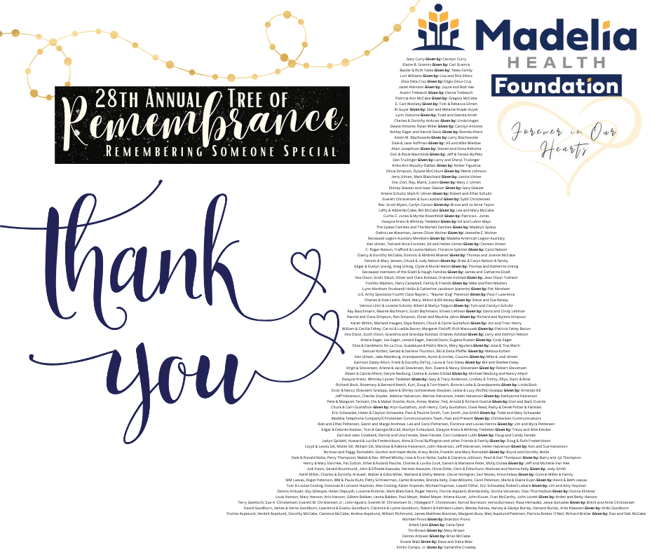 Each year we remember or honor our loved ones by placing lights on the Madelia Health Foundation Tree of Remembrance. The tree lights shine brightly from November 18th to January 3rd. There is also a new tree located at Pioneer Bank for their Tour of Trees event.